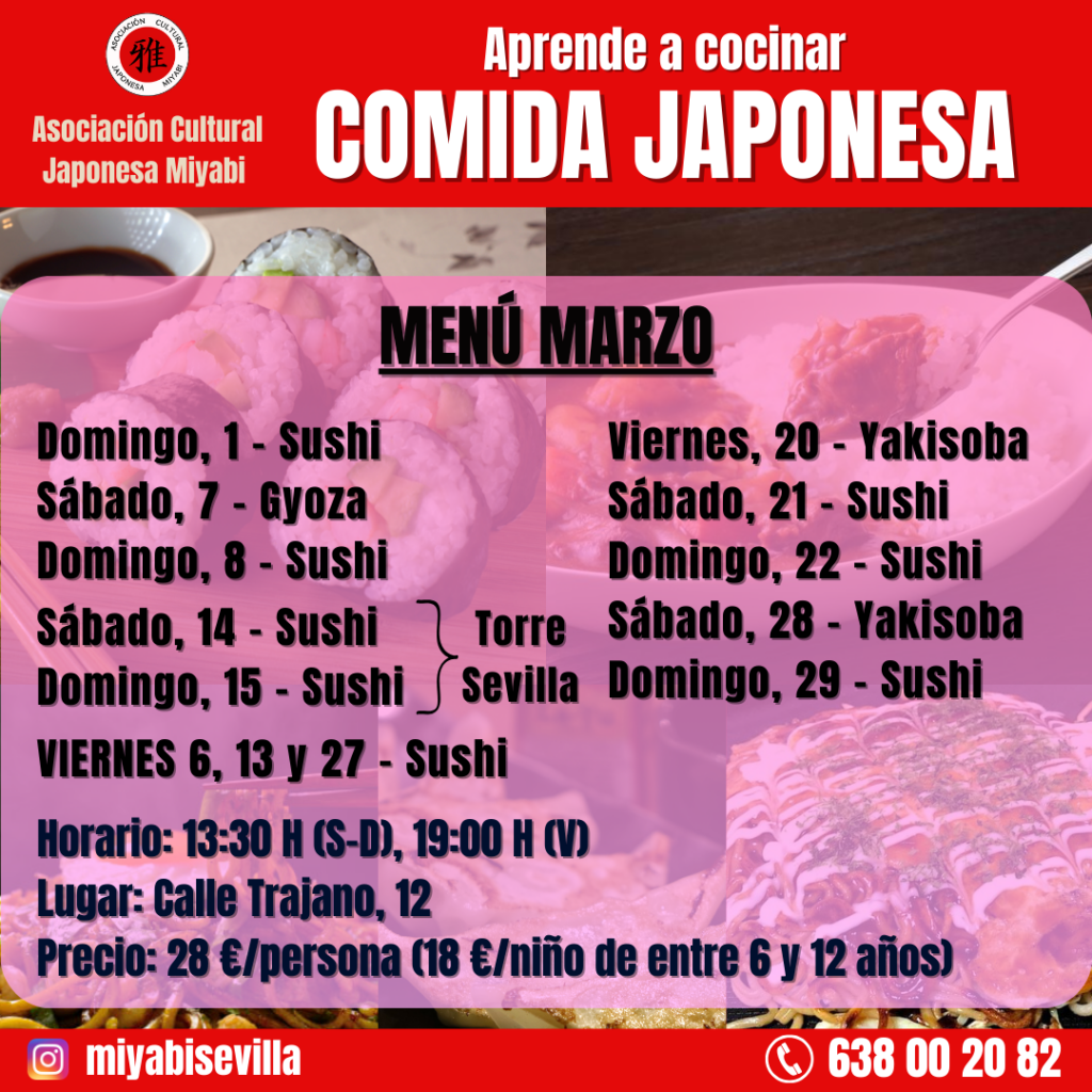 Todos los talleres se desarrollan en nuestra sede (C/ Trajano, 12), aunque de forma especial celebraremos los talleres de los días 14 y 15 de marzo en Torre Sevilla. Sigue nuestras redes sociales (Instagram: @miyabisevilla) o no pierdas de vista nuestra página web si quieres saber qué se cuece dentro y fuera de nuestra cocina.